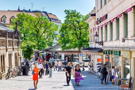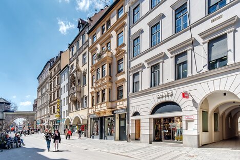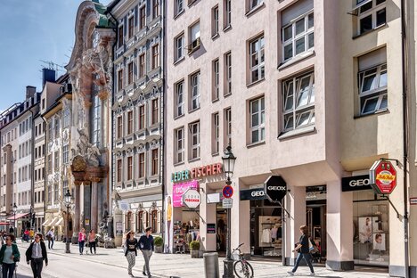 Stores for daily needs, many small stores, department stores and large specialist stores in the pedestrian zone. Fresh food every day at the Viktualienmarkt