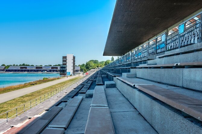 In 1972, an artificial regatta course was built in Munich-Oberschleissheim on the occasion of the Summer Olympics. This two-kilometer long and 135-meter wide Olympic course is one of the fairest and best in the world. The facility is regularly maintained and has an excellent infrastructure. Visitors have the opportunity to watch competitions and award ceremonies up close in the stadium-like grandstand, which seats 9,500.