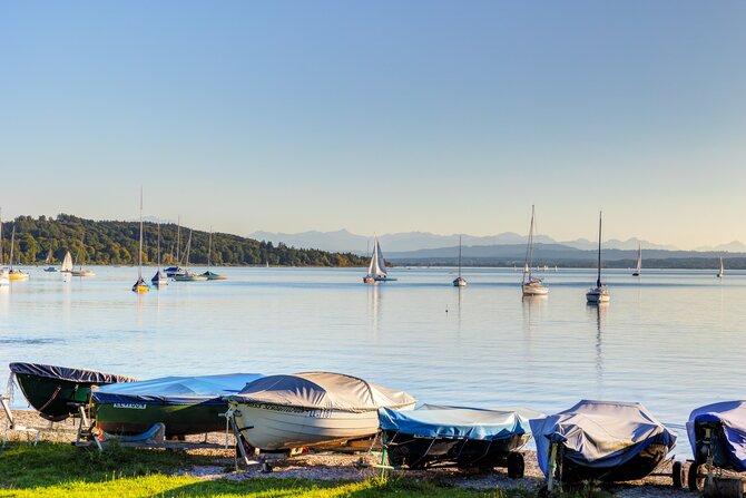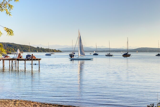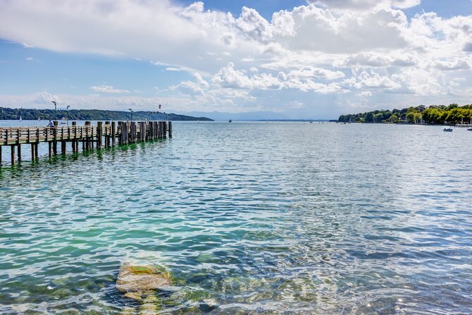 Lake Starnberg, also known as Würmsee, is located roughly 20 km south of Munich and is the second largest lake in Bavaria, after Chiemsee. Bavaria's "bathtub" was already a popular recreational area at the beginning of the 17th Century. The picturesque countryside around the lake is dotted with many old buildings and numerous palaces. The village of Possenhofen with its castle "Possi", as it was affectionately called by Empress Sisi, is, along with Ammerland and Berg, just one of the places worth seeing around Lake Starnberg. At the height of the votive chapel near Berg Castle, a wooden cross in the water commemorates the place of death of Bavaria's King Ludwig II.