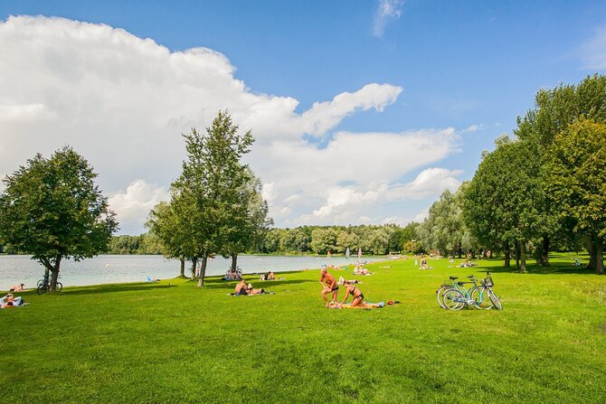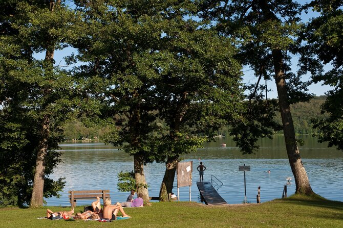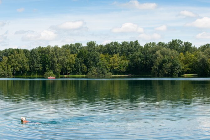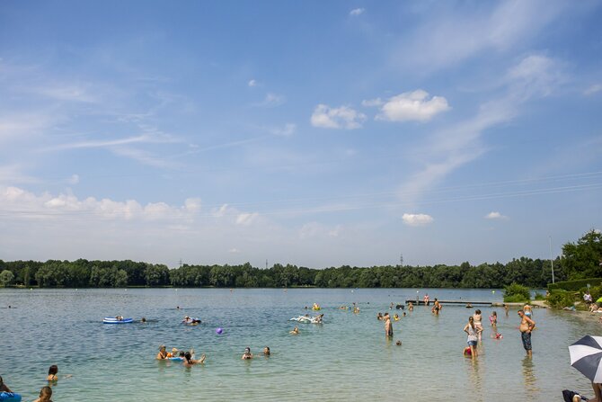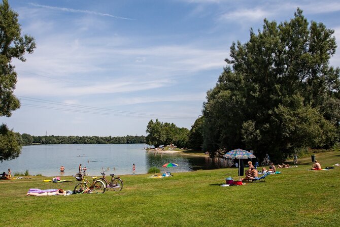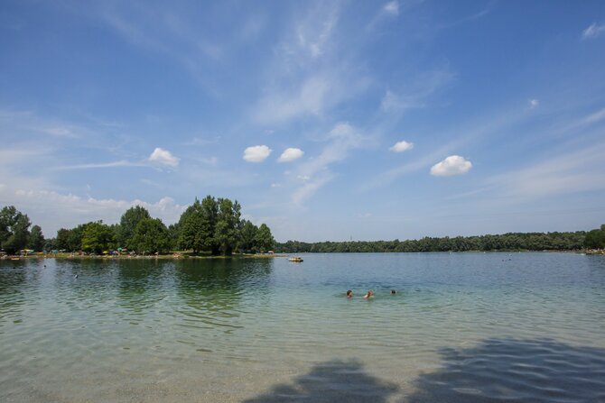 This well-frequented bathing lake - on hot days up to 25.000 visitors - measures 32 hectares (79 acres) and has excellent water quality. The grassy shores of the lake offer all the recreational activites anyone could wish for. A separate nudist area, a place for surfers, and two beach volleyball courts increase the fun.