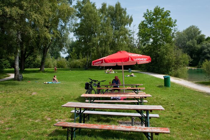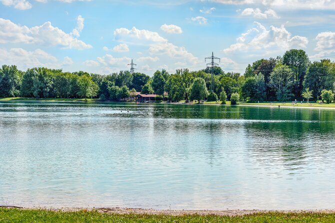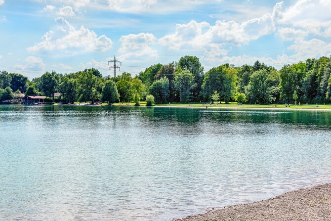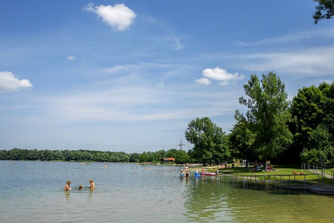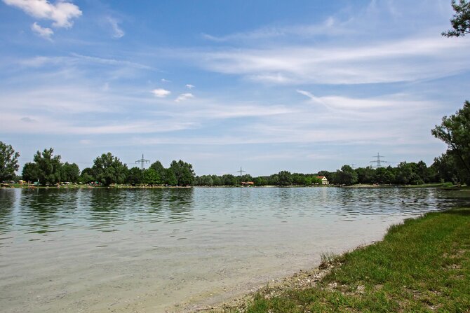 The artificial lake was created in 1979/80 by gravel extraction for highway construction. It is located just outside the town of Unterschleißheim, north of Munich. It is almost eight hectares in size and up to 14 meters deep. There is also a separate, shallow children's bathing beach. A beach volleyball court and several table tennis tables are located near the restaurant. There are nice and shady sunbathing areas and shore sections filled with sand. In wintertime when the lake is frozen you can go ice skating or curling.