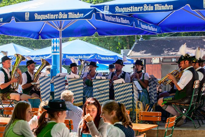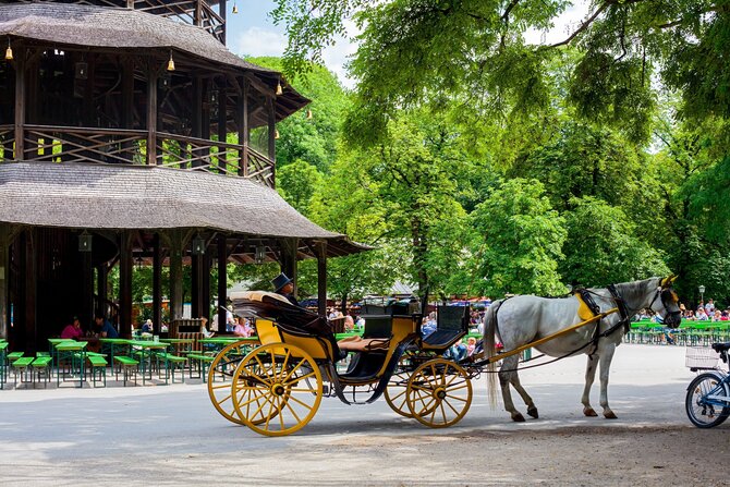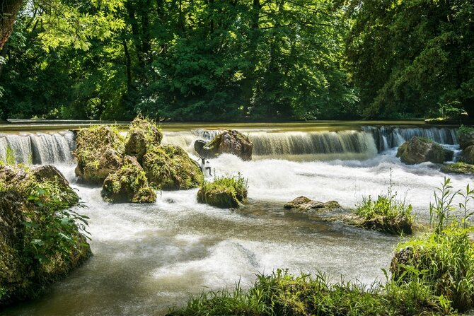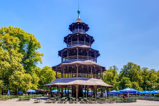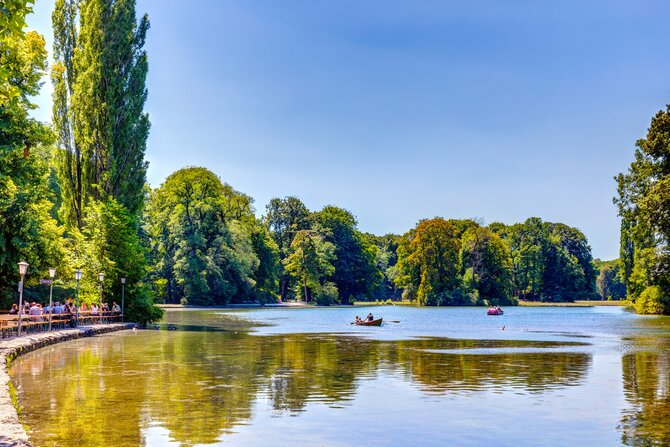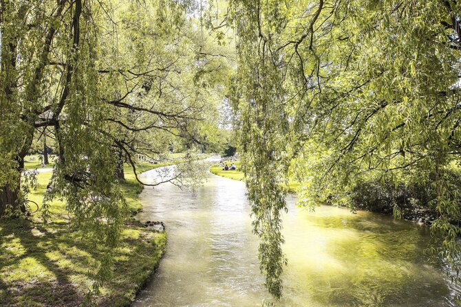 History: In 1789, at the height of the French Revolution, the Electoral Prince Karl Theodor ordered the construction of a public park on the banks of the river Isar, in oder to reduce the dissatisfaction among the people. The populace were enthusiastic about the spacious garden, laid out in the English style, imitating the natural flora without decorative plants and trimming. Today, covering approximately 4 km², it is one of the largest urban public parks in the world. From early morning until late at night, the park is filled with joggers, horse-back-riders, bikers, baby carriages, dogs, and lovers. Especially on sunny days, the southern part of the garden is full of life: sunbathers make themselves comfortable on the meadows alongside the stream, the "Eisbach", or refresh themselves by taking a short swim. In the south, surfers train on - and in - the cold water. One can watch the lively scene of musicians, ice-cream-vendors, ball- or frisbee players, Brazilian capoeira dancers, and jugglers on foot, in a horse-drawn carriage, or on a rickshaw-tour. The small, round temple "Monopterus" stands out. Further to the north, one can join tourists and locals around the Chinese tower, to enjoy a "Maß" of Bavarian beer to the sound of a traditional brass band. Those who prefer a more elegant atmosphere, can visit the beer garden at "Seehaus". The northern part of the English Garden is more peaceful, making it ideal for those who prefer to simply take a quiet walk or relax on the grass.