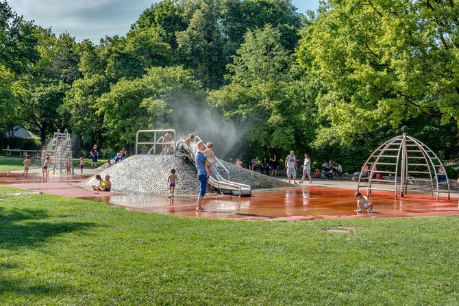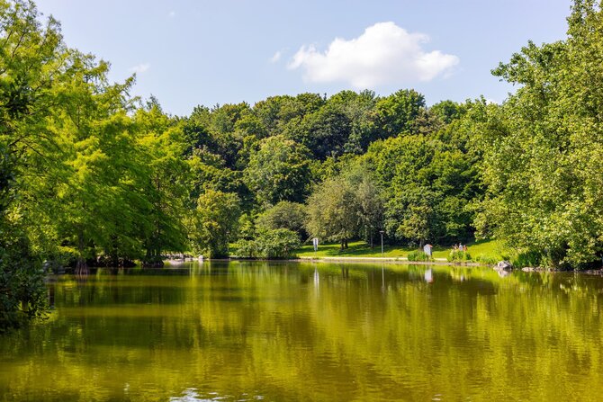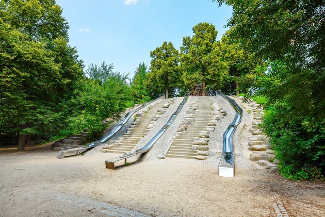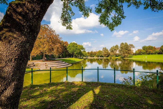 The Ostpark is characterized by its man-made hilly landscape and the many small canals. The meadows are perfect for relaxing or playing ball, the wide paths for skating, cycling or jogging. Afterwards, you can treat yourself to a little refreshment in the beer garden by the picturesque lake or go for a swim in the neighboring public pool Michaelibad.