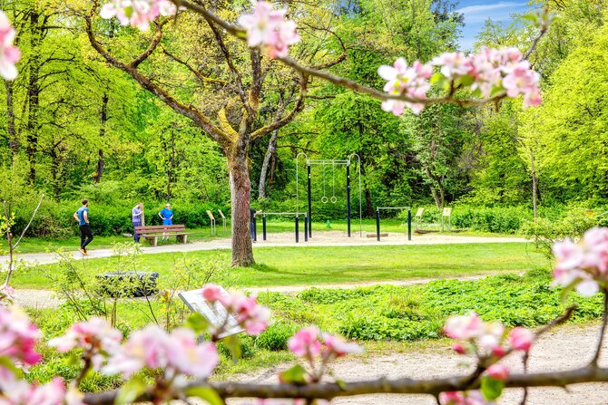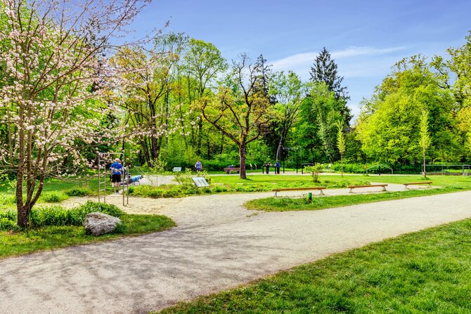 This romantic, woody park with its wide gravel paths is the ideal place for relaxing walks or outdoor sports: ball games, cycling, jogging, table tennis, or a run on the "Fitness Trail" will soon make you forget your daily hassles.