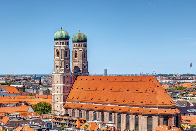 "Cathedral of Our Dear Lady". The almost 100 meter tall towers of this late gothic brick building, erected between 1468 - 1488 by Jörg von Hasbach, are Munich's most famous landmark. Its mighty saddle roof towers above the rest of the old city. After being badly damaged and plundered during the war, the cathedral was renovated in several stages. The south tower, which is open to the public, has a wonderful view of the city with the Alps in the background. Inside the cathedral, there are many art treasures, such as the late 14th century choir windows, which were part of the original church, the Apostol and Prophet statues by Erasmus Grasser, or the 18th century gilded reliefs of scenes from the life of Mariens by Ignaz Günther. The crypt under the choir stalls houses the oldest graves of the Wittelsbach family, including that of Emperor Ludwig the Bavarian. Legend has it that the Devil demanded that the cathedral be built without windows. As he came to inspect the building, he left a footprint in the entrance. Through an architectural trick there are no windows visible from this "devils footprint", so that the devil was satisfied and left.