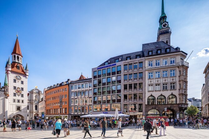 This square, previously called Schrannenplatz, has been the heart of the city since Munich was founded. It was a salt- and grain market, a tournament arena, and a place of execution. A fish market was held near the Fischbrunnen (fish fountain), which is worth seeing. Nowadays, locals and tourists throng here to shop or take a stroll. The 11-meter Mariensäule (Mary's column) was built to fulfil a vow made by Electoral Prince Maximilian in 1638, after Munich and Landshut were saved from pillaging by the Swedish. It is considered to be the center of the city and is therefore not just a popular meeting place - all distances are measured from here.