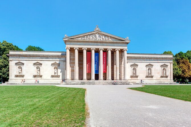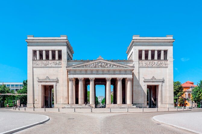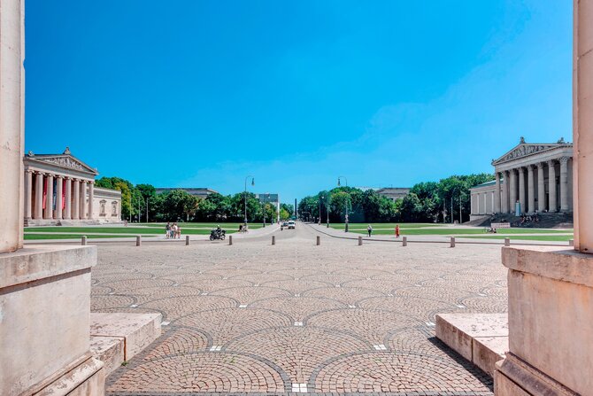 This neo-classical square was built by the architect Leo von Klenze between 1817 and 1862, on the orders of King Ludwig I. In the north, one can find the corinthian-style Glyptothek, to the south, there is the ionic-style building housing the State Collection of Antiques, and in the west, there is the doric-style Propyläen gateway, which is based on the gates of the Acropolis in Athens and serves as a memorial to the Greek war of independence. Together, they form the "Athens on the Isar", a wonderful temple for the arts. The Nazis paved the previously grass covered square to use it for parades and party meetings. A monument, which had been erected in the east commemorating the victims of the putsch in 1923, was destroyed in 1945. The square was then used as a parking space until it was finally grassed over again in 1988. Today, this grandiose square is used as a backdrop for open-air concerts, operas and movie showings during the summer months.