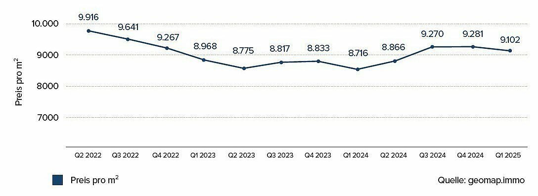 Nevertheless, trends can be identified in Munich that influence prices per square meter. Despite the correction phase of recent years, Munich remains one of the most expensive real estate locations in Germany. Current market data - depending on the source and calculation method - continues to show high average or median values for apartments. While listing data portals currently show around €8,165/m² for condominiums and around €9,214/m² for houses, other market models (e.g. median values from large data pools) also show some apartments at around €9,179/m². These differences underline the importance of classifying the data source.