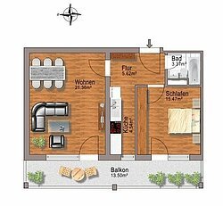 This bright, fully furnished city apartment is located on the 5th floor of an apartment building with elevator from 1970. The apartment consists of a light-flooded living room with access to the sunny west-facing balcony and a spacious bedroom which also has accesses to the balcony. The functional, open kitchen with window is equipped with a kitchen unit and even has space for a