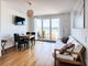 kitchen open to the living area, with window, refrigerator with freezer compartment, dishwasher, ceramic stove top, electric oven, extractor hood, microwave, kettle, toaster, dinnerware, kitchen utensils and equipment provided