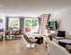 open plan kitchen visually separated from the living room by a breakfast bar, with window, induction stove, extractor hood, electric oven, fridge-freezer combo, dishwasher, microwave, espresso machine, kettle, dinnerware, kitchen utensils and equipment provided