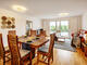 The adjoining and separate fitted kitchen with fridge-freezer and dishwasher, as well as high oven and microwave, impresses with granite worktop and backsplash with integrated lighting and a custom-made bar table including wine rack, which invites for a quick breakfast as well as a glass of wine in the evening.