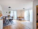 Modern kitchen open to the living area, with window, fridge-freezer combo, dishwasher, induction stove, extractor hood, oven with integrated microwave, dinnerware, kitchen utensils and equipment provided